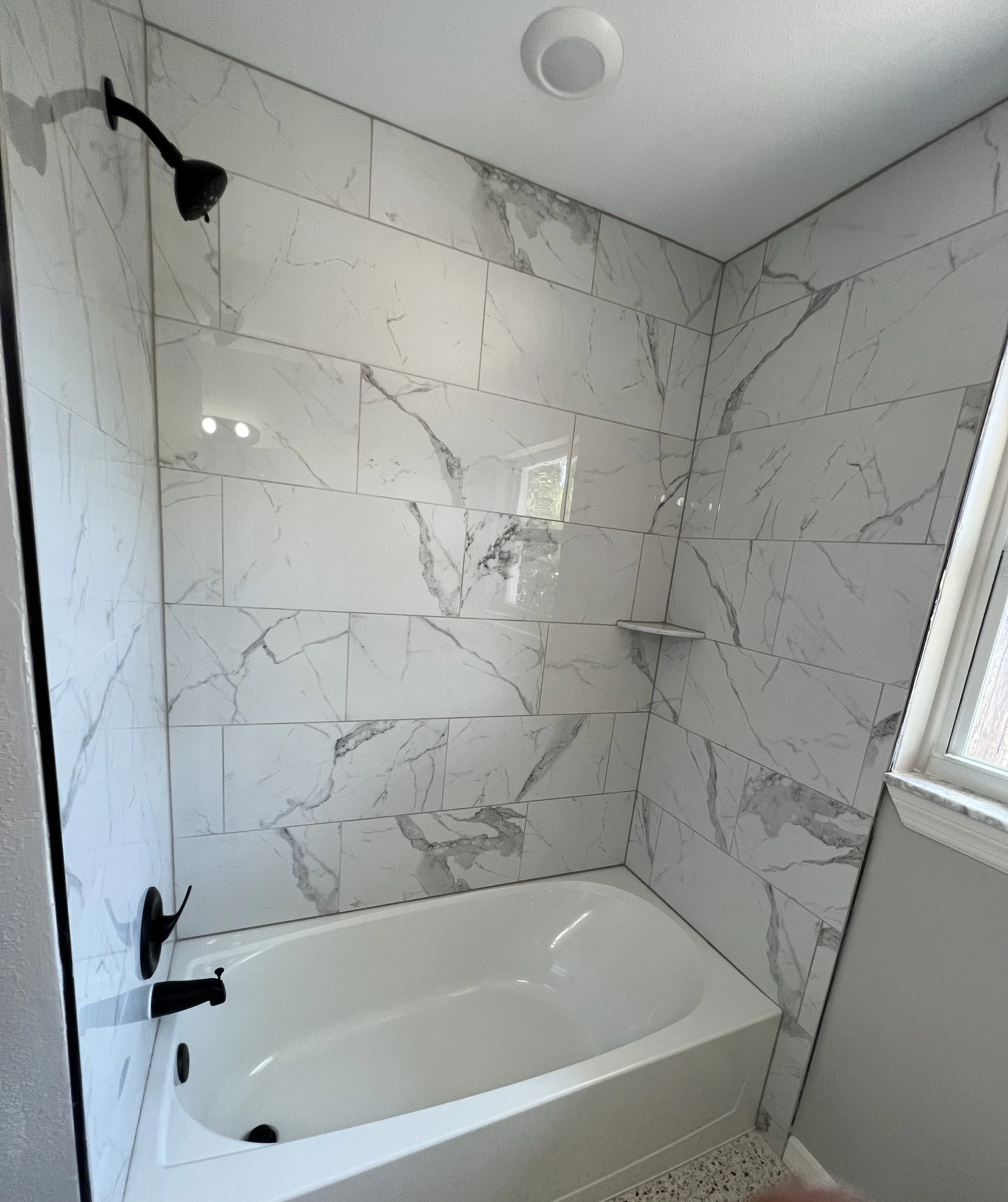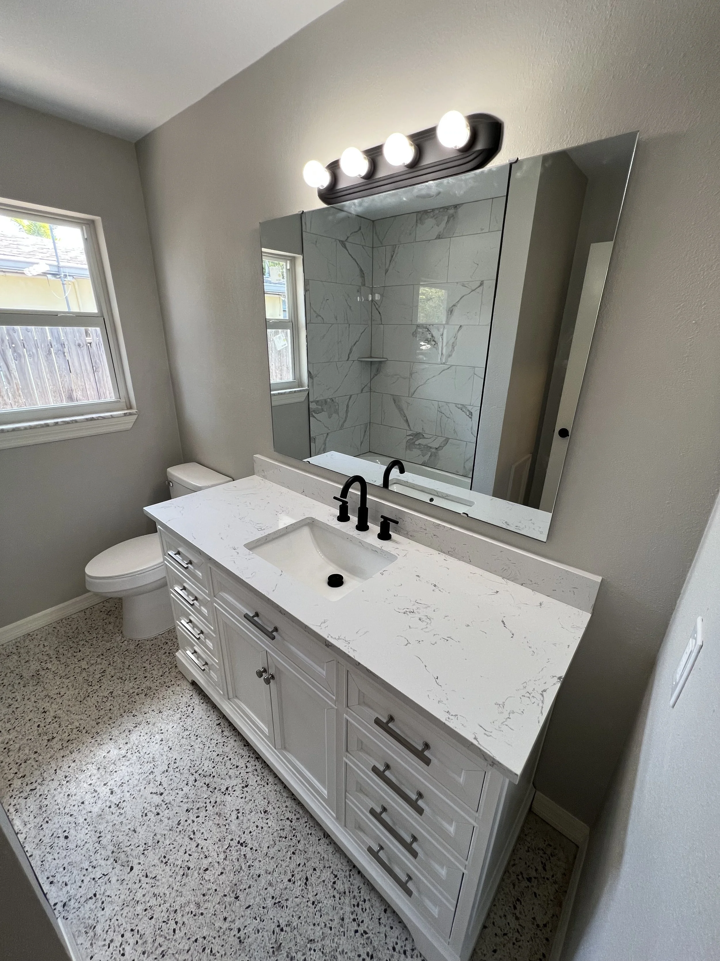 Bath update: large-format marble-look tile, matte black fixtures, clean framed mirror