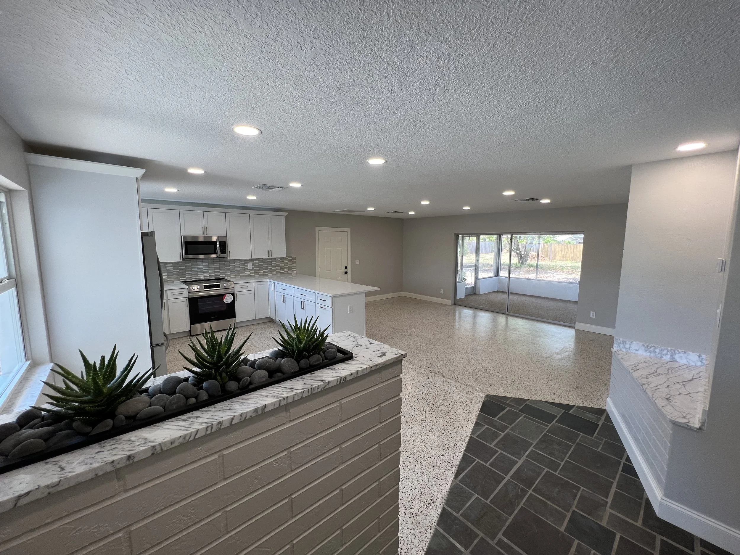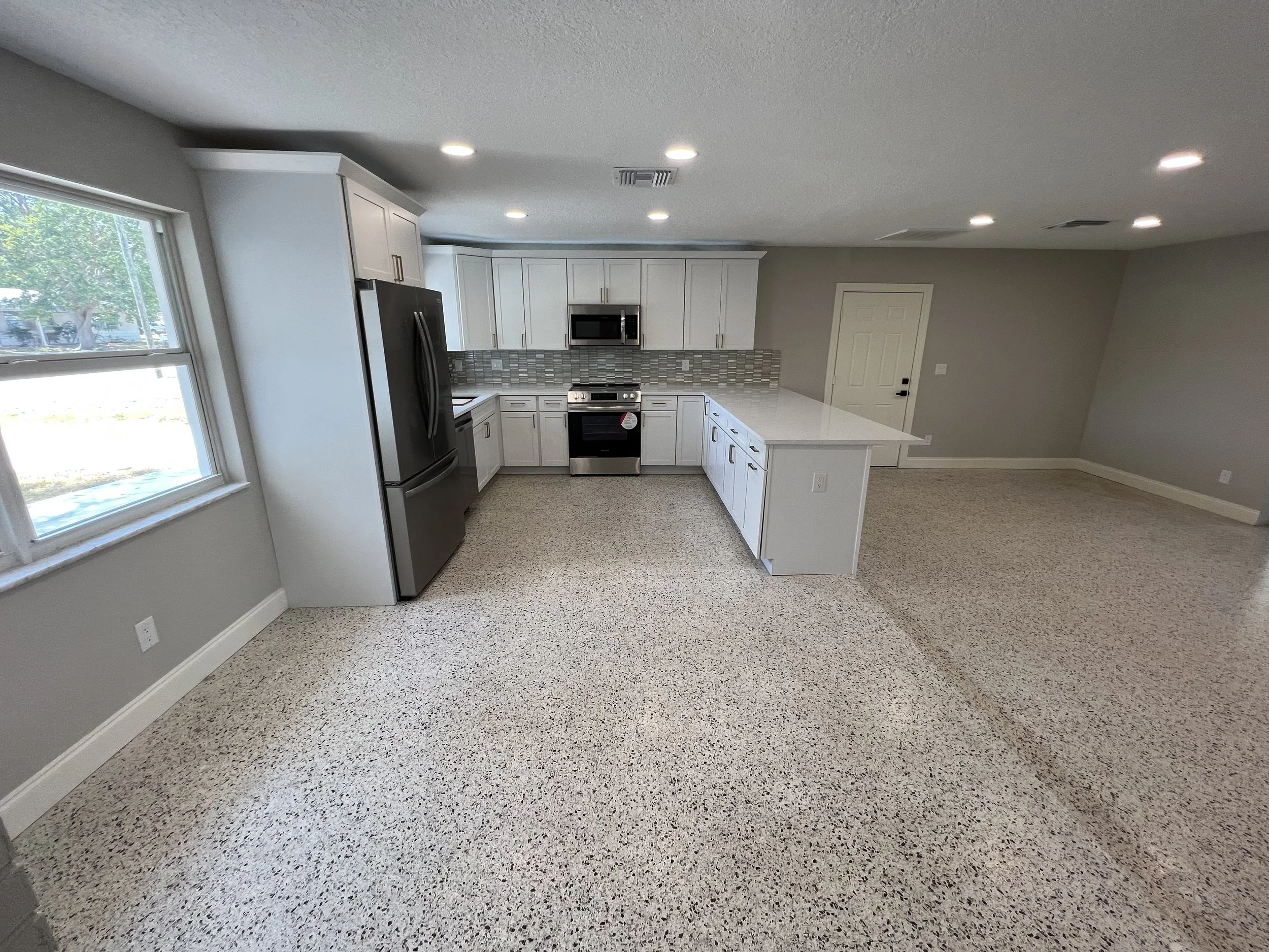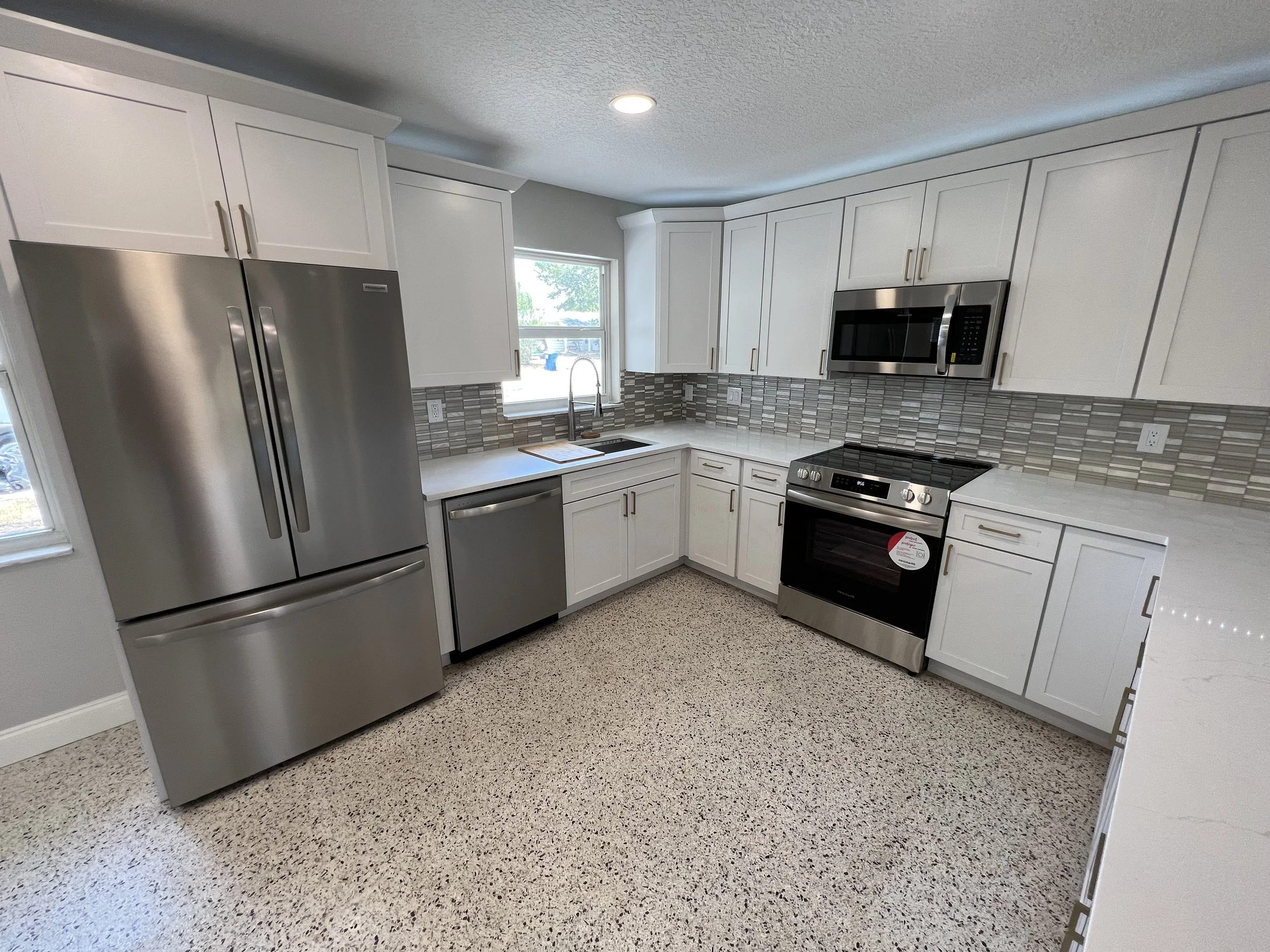 We preserved and polished the original terrazzo floors and paired them with clean, modern updates for a fresh mid-century–inspired vibe. The kitchen opens to the living area with a seating peninsula, and the bath got a crisp, hotel-style refresh. Simple lines, soft grays, and bright whites keep the look timeless while honoring the home’s era. Look at the original appliances from the 50’s when we started.